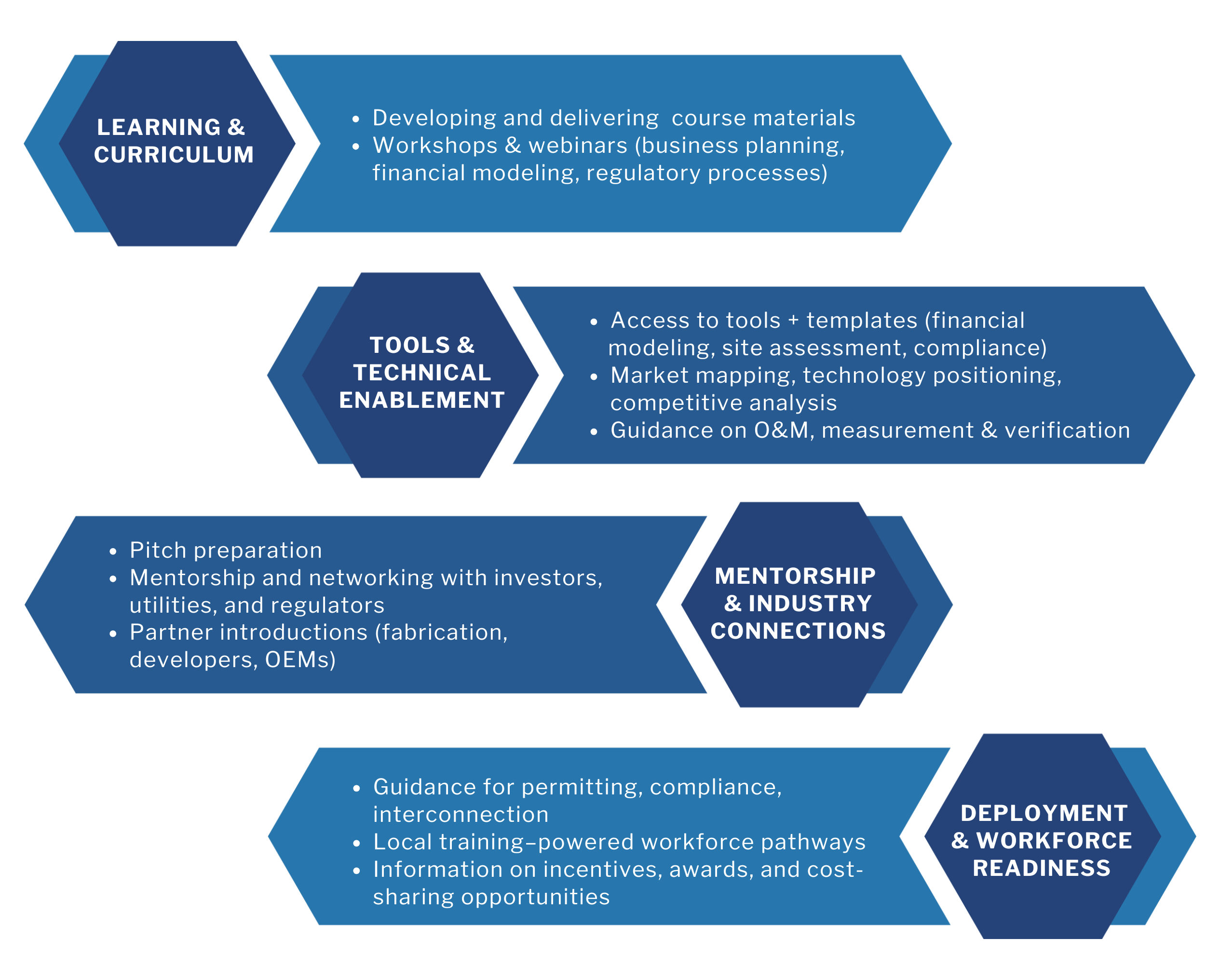 Design the accelerator around 6 challenge areas: Technology & Prototyping; Regulatory & Permitting; Market Readiness; Manufacturing & Supply Chain; Site Deployment & Operations; Workforce & Community Integration.